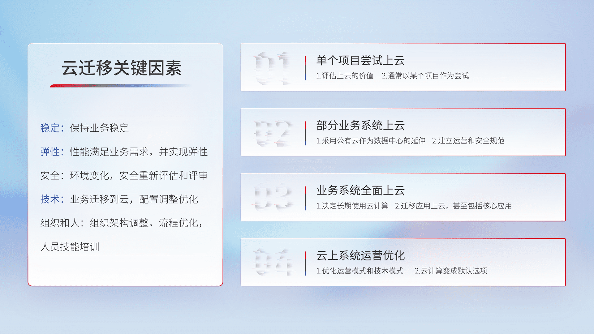 结合实际业务,,,从规划设计、、、、云平台选型、、、、云原生改造、、、、数据迁移、、集成交付,,,,迁移全过程为客户识别最佳上云路径,,做好风险识别管理,,,,设计网络架构、、、、身份权限、、、、安全审计合规、、操作审计、、、、日志审计、、、、监控告警策略、、多站点容灾设计等,,对云上基础设施进行整体规划,,,,提升IT治理水平,,,以满足弹性、、、高可用、、高性能的需求。。。。